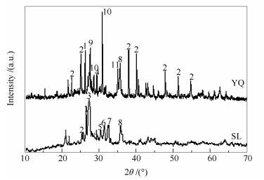 图 3为SL和YQ石油焦灰的XRD谱图。