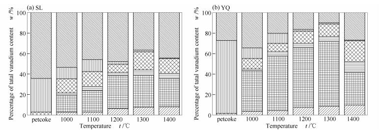 由图 4可知,经过高温燃烧处理后钒在石油焦残渣中的赋存形态发生了较大变化。对于SL石油焦,随着温度的升高,有机质结合态钒逐渐减少直至1200 ℃时消失,而稳定态钒则在1000-1300 ℃逐渐减小,在1400 ℃时,含量有所增加,至于气态挥发物、水溶态和部分离子可交换态、碳酸盐结合态和氧化物结合态钒的含量则逐渐增加;对于YQ石油焦,唯一与SL石油焦不同的是稳定态钒在1000 ℃时比原石油焦有所增加,其他变化则一致。可能是因为石油焦中伴生的无机矿物组成的差异(见表 2),有机结合态的钒元素发生矿物反应的结果。