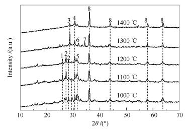 图 5为SL石油焦在不同温度下残渣灰的XRD谱图。由图 5可知,在1000-1200 ℃,残渣中钒以偏钒酸钠和钒酸钾的形式存在;在1300 ℃,钒以焦钒酸钙和含钠、镁和铁等钒酸盐晶体形式存在;在1400 ℃,钒以焦钒酸钙的形式存在。这些变化说明,石油焦在燃烧过程中钒与其他矿物质发生了复杂的化学反应,在不同温度下形成了不同化合态的钒。由图 4可知,与有机质结合态的钒在不断减少并最终消失,说明它在燃烧时被分解,同时释放出钒,钒在高温下容易与Ca、Na、Fe和K等矿物元素发生反应[14]。