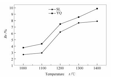 由图 6可知,随着温度的升高,钒的挥发率不断增大且呈现阶段性挥发的特点。在1000-1100 ℃,钒的挥发量缓慢增加,而在1100-1200 ℃时,钒的挥发量快速增加;在1200-1400 ℃时,钒的挥发量又缓慢增加。其原因在于有机质结合态的钒在1000-1200 ℃逐渐分解,释放出小部分V转化为具有挥发性化合物。由于这两种石油焦中钒的有机结合态的含量不同,使钒的挥发量不同。对于YQ和SL石油焦,钒的挥发量最大分别为9.88%和7.83%,而与之相对应的YQ、SL石油焦中有机质结合态钒的质量分数分别是71.35%、32.75%。此外,在燃烧过程中有机质结合态钒完全消失,而稳定态钒只是略微减少,由此可得出石油焦中有机质结合态钒的量决定了钒的挥发量。