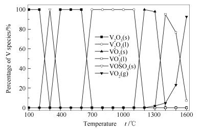 图 7为石油焦燃烧过程中钒的迁移转化过程的热力学分析。由图 7可知,生成钒化合物与温度有紧密的关系。由于这些含钒化合物有不同的熔点,随着温度的升高,含钒化合物转为气态,致使钒的挥发性呈现阶段性特点。由图 7还可知,在1200 ℃时开始生成的VO2(g),随温度的升高VO2(g)的量也越来越多,这也符合VO2在1225 ℃开始挥发的性质[15]。结合SL石油焦在燃烧过程中钒的挥发行为和热力学平衡模拟计算,两者的结果相吻合。其中, 个别温度数据的差异,可能是实验误差或者热力学平衡计算的局限性。在实际操作中,会发生许多化学反应且这些反应相互制约使其很难达到热力学平衡[16]。
