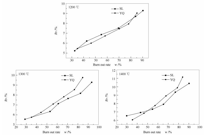 在石油焦燃烧过程中,随着可燃组分的减少,石油焦体相中封闭孔道被打开,其孔隙结构变得丰富,灰分逐渐富集和团聚,会对钒的挥发性产生重要影响。燃尽率是表示燃料燃烧程度的重要参数,可以间接反映石油焦中的灰含量及其空隙结构。图 8为1200-1400 ℃条件下,钒挥发率随燃尽率的变化。由图 8可知,燃尽率为30%左右时,钒的挥发率都在4%以上,且随着燃尽率的升高,钒的挥发率缓慢增加。这主要是因为在燃烧起始阶段,石油焦中的有机质快速燃烧,使有机质结合态钒快速释放出来,且随着燃尽率的提高,钒与硅、氧、硫和铁等这些元素形成的矿物质开始熔融、转化,并释放出一部分的钒,但反应速率过程较低,所以钒的挥发率增加的相对较慢。同时,对比图 8可知,在燃尽率相近的情况下,不同石油焦的钒的挥发率也略有不同,这主要是因为在燃烧过程石油焦中钒的赋存形态发生了显著的变化。