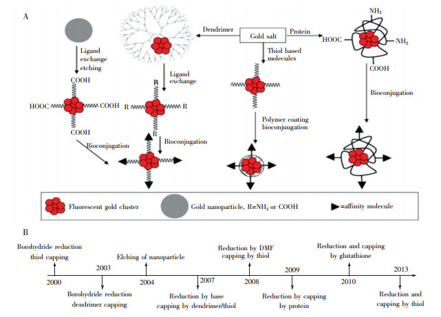 纳米簇的制备方法已有很多综述评论。以研究最为广泛的Au簇为例,其发展历程如图 1所示[8]。本部分仅涉及与ECL相关的常见纳米簇的制备。以下将按配体的分类对纳米簇制备作简要介绍。