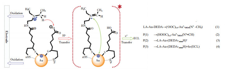 提高纳米簇ECL效率是ECL分析应用过程的关键问题。2016年,Wang等[31]在通过自发光方式显著促进了ECL共反应。该工作将共反应物N, N-二乙基乙二胺(DEDA)共价连接到硫辛酸(LA)稳定Au簇上,由于两者的氧化还原活性相匹配,可以直接发生强烈的近红外ECL(发射波长大于700 nm)。相比常规的共反应物自由碰撞模式,这种新颖设计模式减少了物质传递过程中涉及的自由基中间体寿命问题,因而ECL显著增强(图 2),其效率甚至高于Ru(bpy)32+/三正丙胺体系。这种多重集群式的设计利用了单个Au簇的多个能级和多个DEDA配体,节约了共反应物的用量,ECL氧化还原起始电位也低至0.78 V (vs Ag/AgCl)。该策略具有普适性,可以延伸到其它材料的共反应体系,此近红外ECL也可在生物检测时显著降低干扰信号。最近,他们还发现LA-Au的ECL可以被乙二胺四乙酸(EDTA)增强,pH 7.4时增强效果最佳[32]。由于Mg2+与EDTA络合,ECL信号可以被Mg2+调控。该体系具有无需除氧、生理pH条件发光、低干扰的近红外发射等诸多优点,对其传感和分析应用都非常有利。