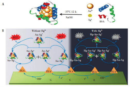 除常规的Au、Ag簇以外,研究人员也在寻找其它具备高效ECL特性的纳米簇。Zhai等[36]通过调节HAuCl4/AgNO3的摩尔比制备一系列BSA-Au-Ag双金属纳米簇(图 3)。该纳米簇与三乙胺共反应的ECL性能优于单金属簇。其最佳Au:Ag投料比为6 : 1,此时ECL增强了5倍。银掺杂后,ECL的峰值电位和起始电位较Au簇分别降低了0.23和0.10 V,ECL光谱也蓝移了38 nm。由于Hg2+能通过形成d10-d10金属亲和键结合到双金属簇上,猝灭其ECL,由此提出一种高灵敏、高选择性和高稳定性的Hg2+检测ECL传感器。Zhao等[37]发现了以BSA为模板制备的Cu簇能与肼共反应的高效阳极ECL体系。其ECL发射波长为433 nm,较其荧光峰红移了25 nm。其可能发光机理是肼被氧化时,能量转移到Cu簇上产生其激发态,形成ECL。相比之下,Cu簇与三丙胺或H2O2的共反应ECL则很微弱。多巴胺阳极氧化产生的醌类能猝灭ECL,因此该ECL系统能高灵敏测定多巴胺,检出限低至3.5×10-13 mol/L。Han等[38]制备了2-巯基-5-正丙基嘧啶(MPP)为配体的铜簇[Cu8(MPP)4],研究其在湮灭模式及三丙胺共反应模式的ECL细节。该铜簇的ECL位于605 nm,与荧光一致。有机相电化学表征证实其氧化还原行为源于Cu8+/Cu82+,Cu8/Cu82+,Cu8/Cu8+簇等电对。理论计算认为该ECL过程仅涉及单一的金属簇激发态,此激发态对应于从金属到配体的电子转移,其释放能量和簇的LUMO→HOMO能隙近似。因此,发展新型高效的金属簇在ECL生物传感方面也同样具有理想的应用前景。