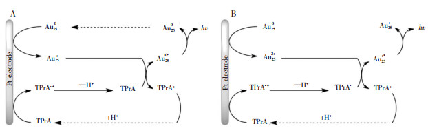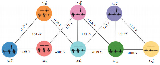 Hesari等[11]最近详细总结了相关ECL机制,认为不同的ECL发射取决于不同的电激发中间体,而这一过程与不同施加电位下电极表面的电子交换情况相关。如在不同电位下产生的Au250*和Au25+*,ECL机制类似(图 5);而Au25-*的ECL过程则因为要预先转化为Au252+等,情况复杂得多,需结合Latimer型图作具体分析。