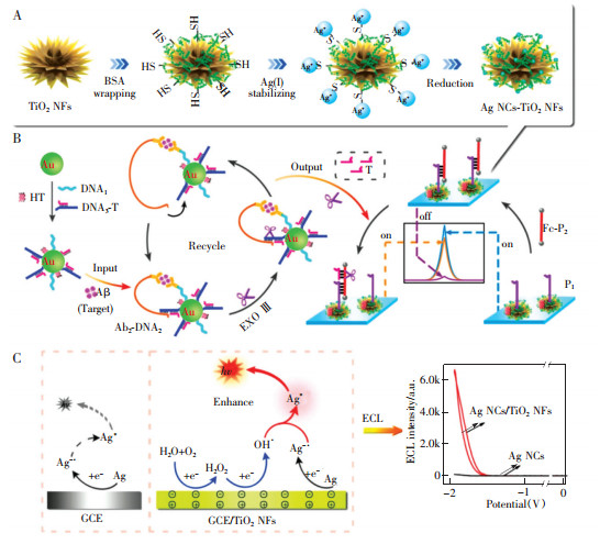 将纳米簇ECL与核酸的生物放大策略相结合也是一类常见ECL增强方法。Chen等[49]提出了一种简单而超灵敏的microRNA的ECL生物传感器。采用滚环放大(RCA)技术放大信号,结合原位电化学生成Ag簇作为信号探针。该工作巧妙地设计了一个圆形模板,其中一端为富含鸟嘌呤区域,另一端为miRNA的识别域。以靶miR-21为靶标模型,其与圆形模板杂交形成三元P结(Ternary “P” junction)结构,由phi29DNA聚合酶启动RCA过程,miR-21从模板上释放后继续进入RCA循环。由于模板中富含鸟苷,RCA循环后其互补链上将产生大量富胞苷的周期性串联序列,可作为模板原位电化学合成Ag簇,再与S2O82-共反应产生ECL信号。最终的ECL强度取决于Ag簇量,而后者与靶miR-21浓度正相关。该传感器可以选择性地检测miR-21,检测范围达6个数量级(10-16~10-10 mol/L),检出限低至22 amol/L。以miR-21高表达的肺癌A549细胞和miR-21低表达的宫颈癌HeLa细胞作为模型,检测结果证实了该方法的可靠性。Zhou等[50]以ECL猝灭剂二茂铁(Fc)-DNA结构介导的ECL开关为信标,结合TiO2纳米花对Ag簇-溶解O2共反应ECL的促进作用,设计了淀粉样蛋白(Aβ)的生物传感器(图 6)。微量的靶蛋白被免疫识别后能诱导形成DNA纳米结构,利用核酸外切酶Ⅲ剪切产生大量次级靶DNA,后者结合到电极上的ECL信标后继续被剪切,触发Fc的释放,ECL信号得以恢复。其检测线性范围为50 fg/mL~500 ng/mL,检出限低至32 fg/mL。Jie等[51]使用DNA酶辅助目标循环和杂交链反应多重扩增策略在电极上获得大量Ag簇,作为凝血酶检测的ECL探针。凝血酶首先与包含其适配体的发夹DNA结合,诱导DNA解链,所得单链DNA与特异底物序列结合,再用DNA酶循环切割产生大量底物碎片。这些碎片被Au纳米颗粒修饰电极上的互补DNA序列捕获后,触发富含胞苷发夹的两段DNA探针轮番结合,形成长链DNA。该DNA作为模板与AgNO3温育,以硼氢化钠还原合成大量Ag簇,实现了ECL信号放大。该法测定凝血酶的线性范围为10.0 fmol/L~10.0 nmol/L,有望为各类适配体靶标提供高灵敏的传感平台。Feng等[52]以三链DNA制备位点特异、尺寸均匀和稳定性强的Agn (n=2或3)簇,发现相比于双链和单链DNA模板,三链模板制备的Ag簇与S2O82-共反应时的ECL信号更强,且ECL启动电位降低。由于三链Ag簇和半胱氨酸等硫醇之间有强烈的相互作用,影响DNA模板的微环境而改变ECL强度,该工作开发了一种简单、无标记的硫醇检测方法,可在20%稀释血清基质中检测0.5~50 μmol/L半胱氨酸。因此,通过将生物放大策略融入纳米簇ECL过程,可以更好地拓展其生物分析应用范围。