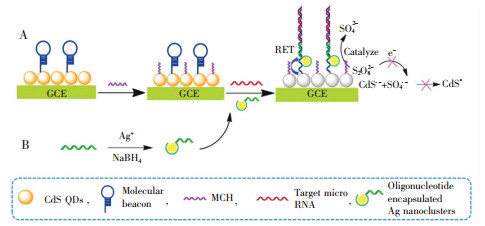 除了本征的ECL,纳米簇还可以作为能量转移受体参与其它ECL检测体系的构建。Cheng等[53]基于CdTe纳米晶和Au簇设计了距离依赖性ECL共振能量转移(ERET)系统,用于miRNA的高选择性检测。他们在电极上固定CdTe纳米晶(荧光发射波长475 nm),将不同长度的GSH-Au簇(荧光发射波长约580 nm)标记的发夹DNA连接到CdTe上,此时CdTe纳米晶与Au簇之间的能量匹配导致CdTe与溶解氧的共反应ECL发生猝灭。DNA连接酶选择性将miRNA和辅助DNA连接在发夹DNA链上,形成长链的DNA-RNA异源双链体。此时ERET因为距离太远无法发生,ECL信号得以大幅恢复;而如果按常规的信标方式,仅由miRNA打开发夹DNA时,CdTe纳米晶与Au簇之间距离过短,仍存在ERET效应,ECL信号较弱。该工作以ECL为“尺”设计距离依赖性的ERET系统,miRNA的检测线性范围为100 fmol/L~100 nmol/L,且特异性强、速度快。该策略核心的发夹DNA设计多样性强,方便扩展到其它相似体系。同一课题组的Huang等[54]还将该CdTe-发卡-Au簇的ERET组合与Au簇对共反应氧的电催化还原联合,构建双重猝灭途径,用于超灵敏检测ATP。该设计将靶辅助型Zn2+依赖性DNA酶分割为两个片段,在两个辅助DNA和ATP协助下,在发夹上特定位点形成了ATP适体的G-四联体结构。此时Zn2+依赖性DNA酶两个片段靠近,Zn2+存在时即切割基质链,释放Au簇,导致ECL信号恢复。其核心思路在于表面原位产生Zn2+依赖性DNA酶。该传感器可用于血清样品中的ATP检测。Zhang等[55]提出了双ECL猝灭效应的思路来实现信号放大(图 7)。由于CdS纳米晶的ECL发射与寡核苷酸模板制备的Ag簇的吸收带相匹配,Ag簇可以作为CdS纳米晶ECL的能量受体,发生有效的ERET;同时,Ag簇能催化S2O82-的电化学还原,减少有效的共反应物供给,ECL强度进一步下降。当miRNA打开电极上发夹结构后,Ag簇标记核苷酸即结合到电极上,发生双ECL猝灭效应,其效应与miRNA负相关。该方法可检测10 fmol/L~100 pmol/L范围的miRNA,具有高稳定性和重复性。