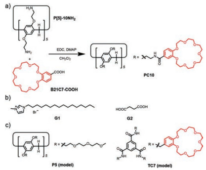 We here report a crown ether-pillararene hybrid system with LCST-type thermo-responsiveness. A pillar[5]arene equipped with ten benzo-21-crown-7 (B21C7) units PC10 was designed and prepared by the simple amidation reaction as depicted in Scheme 1 with a yield of 45%. Thermo-responsiveness of PC10 is not only controlled by the B21C7-involved host–guest interactions, but further manipulated by the pillar[5]arene-based supramolecular complexation.