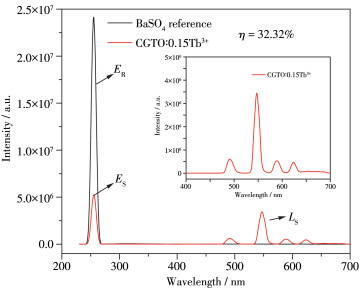 Tb doping concentration (x) 0.05 0.1 0.15 0.2 0.3 0.4 A 4.519 4 4.293 9 4.723 8 4.504 4 4.369 8 4.297 3 B 4.369 2 4.408 6 4.404 3 4.446 3 4.394 7 4.431 1 τ/ms 4.181 7 4.068 9 4.020 6 3.587 2 2.646 8 1.719 1 In order to investigate the luminescence efficiency, quantum efficiency (η) of CGTO∶0.15Tb3+ was tested under 255 nm excitation, which is shown in Fig.10, and the value was obtained by the following equation[28]: