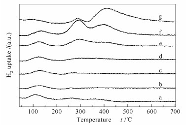 图 1为新鲜催化剂的H2-TPR谱图。由图 1可知, 与未改性催化剂Ru/Al-fresh相比, Ni改性后的催化剂呈现出不同H2-TPR谱图, 并且随着Ni含量的变化而变化。