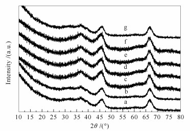 新鲜催化剂直接还原后所得样品的XRD谱图见图 2。与标准XRD谱图对照后发现, 各催化剂均在45.8°、60.8°、67.0°处出现宽化的Al2O3特征衍射峰, 说明载体以γ相存在(PDF#50-0471)。在所有直接还原活化催化剂上未观察到金属Ru和金属Ni的特征衍射峰, 表明金属Ru和Ni在Al2O3呈现高度分散。这与直接还原活化的催化剂具有高活性是一致的。