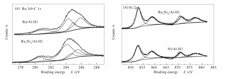 图 3为催化剂Ru/Al-H1、Ru1Ni6/Al-H1及Ni/Al-H1的XPS谱图。由于电子自旋轨道分裂, Ru 3d结合能谱图具有两个特征峰, 分别对应Ru 3d5/2和Ru 3d3/2的电子结合能。其中, Ru 3d3/2的电子结合能位于284.6 eV, 与C 1s谱图发生了重叠, 故不做分析。为此, 固定Ru 3d自旋轨道分裂的裂解能为4.2 eV、峰面积比为3 :2条件下, 对Ru 3d峰进行拟合分析[14, 15]。结合能为284.2与285.6 eV的特征峰归属于污染碳的特征结合能[16]。催化剂Ru/Al-H1上, Ru 3d5/2的电子结合能为280.9 eV, 表明Ru以金属态的形式存在[17]。与Ru/Al-H1相比, Ru1Ni6/Al-H1上金属Ru的电子结合能降低了0.3 eV, 说明Ru周围的电子云密度增加。结合H2-TPR表征结果可以推测, 金属Ru电子结合能的降低可能是其与Ni之间发生相互作用造成的。由于Ru与Ni之间的相互作用, Ru的电负性大于Ni的电负性(分别为2.2、1.91), 电子由Ni转移到Ru原子上, 造成Ru的电子云密度增加, 结合能降低。与Ru1Ni6/Al-H1相比, Ru/Al-H1上Ru 3d强度较低, 而且峰形泛宽, 这说明Ru在催化剂Ru/Al-H1表相中的含量较低。图 3(b)中, Ni 2p3/2的电子结合能为855.8 eV的峰归属于NiO。另外, 结合能分别为853.7和853.5 eV的峰可归属于金属Ni[18]。由图 3(b)可知, 金属Ni的峰面积明显低于NiO的峰面积, 可能是因为还原后的催化剂在表征过程中暴露在空气中导致表面的金属Ni部分被氧化。众所周知, XPS在表征过程中只能对表面的元素组成进行分析, 一旦金属Ni的表面被氧化, 就无法探测到金属Ni[19]。