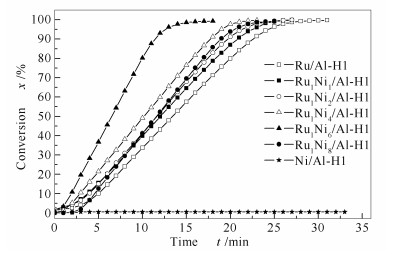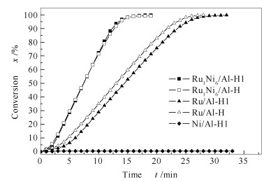 催化剂Ru/Al-H上平均转化速率为10.9 mmol/(g ·min), 与Ru/Al-H1无较大差别。经过Ni改性的催化剂Ru1Ni6/Al-H的活性与Ru1Ni6/Al-H1催化剂几乎无差别, 马来酸二甲酯的转化率完全转化所需时间为16 min, 平均转化速率接近21.68 mmol/(g ·min), 高于未改性样品的催化活性。