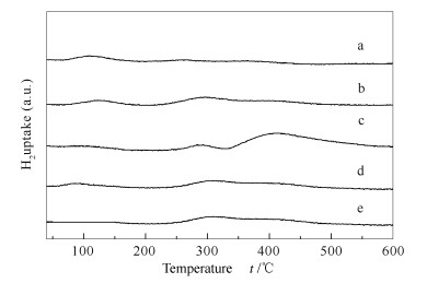 催化剂的物相结构采用德国布鲁克AXS有限公司的D8-ADVANCE型X射线衍射仪, Cu Kα(λ =0.15406 nm)靶进行分析。X射线光电子能谱分析采用Thermo Scientific Escalab 250型电子能谱仪, 使用Al Kα射线(E=1486.6 eV)为激发源, 管电压15 kV, 管电流10 mA, 分析室压力为1×10-9Torr。H2-TPR测试在FINESORB-3010型全自动程序升温化学吸附仪上进行。称取一定量的催化剂经压片、粉碎后置于U型石英管中。室温下, 在Ar氛围中预处理30 min。然后, 以20 mL/min流量通入10%H2/Ar混合气(体积含量)吹扫至基线稳定, 由室温以10 ℃/min升温速率升温, 消耗氢气量采用热导检测器和在线质谱检测。
