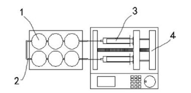 The chip is consisted of cell culture plate, the details as show in Fig. 1: (1) circular cell culture rooms; (2) 0.5 mm diameter tube with a micro valve (black diamond); (3) syringe; (4) injection speed is controlled by microinjection pump. Two units connect with cell rooms separately and the drug is injected at a rate of 2 μL/s into the reaction vessel; three-dimensional ultrafine porous cell scaffold is placed in each cell culture room.