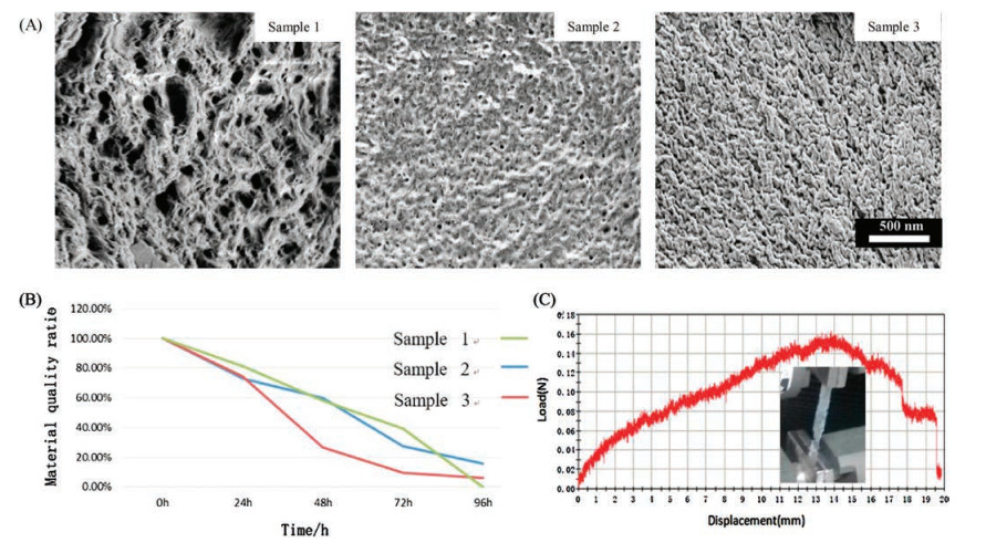 Cell scaffold material requires enough breaking strength and need to be flexible for cell cultivating. Stretching test applied on the cell scaffold using a biomechanics measurement platform to test the elasticity modulus and breaking strength of the materials. As can be found from Table 2, the modulus of elasticity of sample 1 was 0.8 MPa and the breaking strength was 160 mN. In comparison with all other two samples, sample 1 was good elasticity and not easily to be broken.