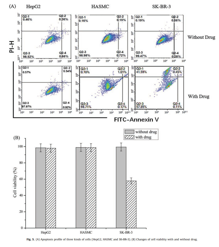 We used Annexin V-FITC (sigma) to test the cell apoptosis in cell model after drug delivery. Cell scaffold was cut into 1 cm2 circular pieces and sterilization. 6 pieces of cell scaffold were lay down into 6 well plates separately to form as a cell chip. Cultivate the treatment and control groups of human breast cancer cell line (SKBR-3), human liver cancer cell line (HepG2) and human aortic smooth muscle cells (HASMC) separately in 6 rooms of the cell chip. Each type of cell has two rooms marked as #1 and #2, #2 rooms were given 20 μg/mL CPT, #1 rooms were with culture medium. After 24 h culture, the cell chips were washed twice with PBS, when introduce to analysis, sterile PBS were used for both #1 and #2 rooms. For cell apoptosis assay, 105 cells (three types separately) were gathered and suspended in binding buffer. The cell aliquots were then stained with 5 μL Annexin-V-FITC and 5 μL Propidium Iodide and incubated for 10 min in darkness. Then, the apoptotic induction was assessed by flow cytometer.