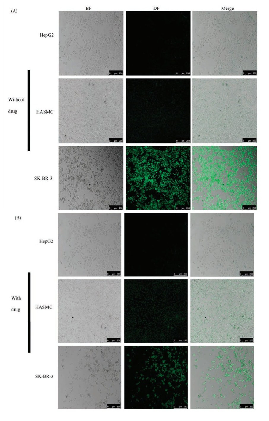 As show in Fig. 6A, all the three types of cells were first observed by bright field microscope to describe the cells morphology then in dark field for observation of fluorescence from DAF. From the bright field (BF) and merged image, it is clearly show that without drug treatment, human cells HepG2, HASMC and SK-BR-3 cell line are all in large density after 24 h of cells culture. Dark field (DF) images shown that bright green fluorescence can be found in cell room of SK-BR-3 cell line but week fluorescence signals can be found in HepG2 and HASMC cell lines. Results indicates that DAF cannot combine with HepG2 and HASMC cells.