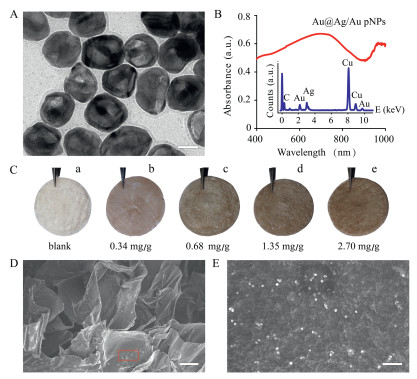 Figure 2. (A) TEM image, (B) UV–vis absorption spectrum, and EDS analysis of Au@Ag/ Au pNPs (inset). (C) Hydrogels loaded with different amounts of nanocomposite. (D) SEM image of a nanocomposite hydrogel. (E) Magnification of the red rectangle in (D). Scale bar: 20 nm (A), 50 μm (D) and 400 nm (E).The encapsulation of the nanocomposites into biologically inert agarose hydrogel would allow spatiotemporally localized gas release, which would be highly convenient for biomedical applications [23, 24]. With this in mind, we loaded the donorpNPs nanocomposites into agarose hydrogel. Fig. 2C shows five nanocomposite hydrogels loaded with different amounts of the pNPs-polymer nanocomposite (0~2.70 mg/g). The loading of nanocomposites causes a colour change in the hydrogel from white to brown. The morphology of the nanocomposite hydrogel was investigated by SEM (Fig. 2D). The nanocomposite hydrogel is assembled from thin wrinkled layers with a spatial network structure, and the layers are decorated with pNPs. As illustrated by the magnified image in Fig. 2E, the pNPs distributed on the hydrogel layers are estimated to be 45.0 ± 6.2 nm in diameter and are therefore likely to be the pNPs.