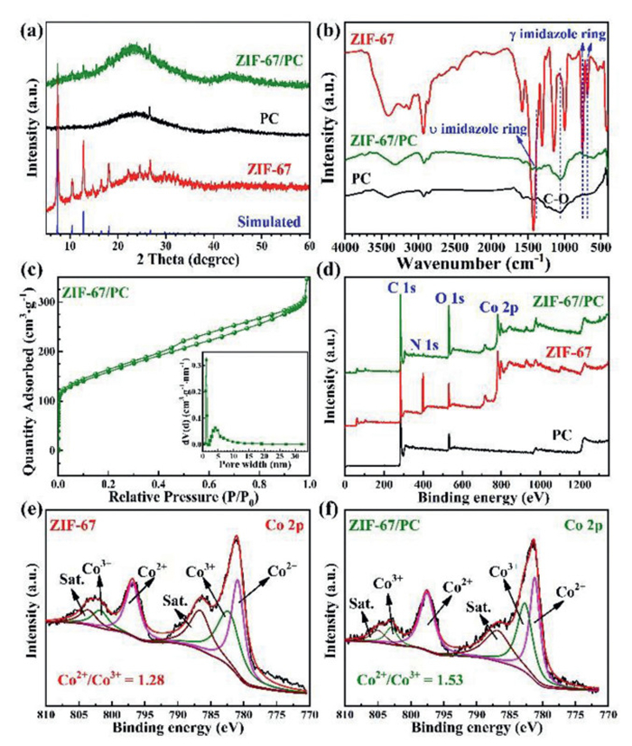 Figure 4.  XRD patterns (a), FTIR spectra (b), N2 adsorption-desorption isotherm and pore size distribution (c), full-range XPS spectra (d), high-resolution spectra of Co 2p (e, f) of samples.
