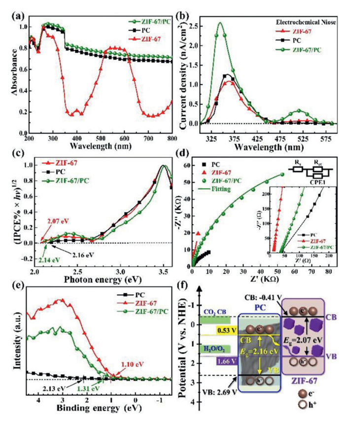 Figure 7.  Chopped LSV curves under AM 1.5 G (a), IPCE (b), PL (c-e), and time-resolved fluorescence spectra (f) of the as-prepared PC, ZIF-67, and ZIF-67/PC samples, respectively.