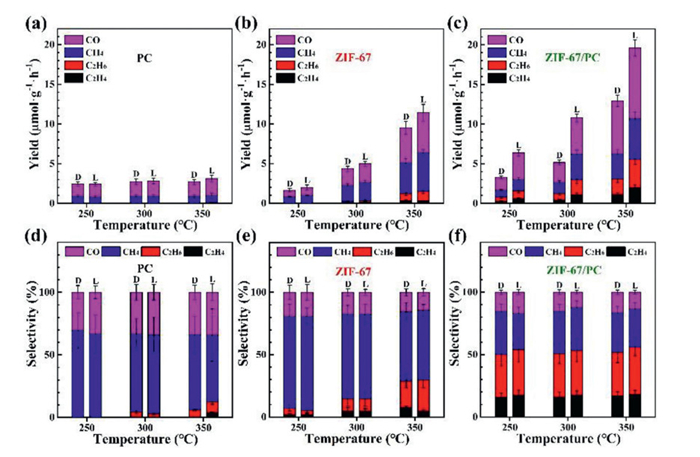 Figure 8.  The reaction performance of the prepared catalysts under different evaluation temperatures. The yield (a-c) and the selectivity (d-f) of thermo-photocatalytic CO2 conversion were obtained from PC, ZIF-67, and ZIF-67/PC, with light (L) and without light irradiation (D), respectively. Amount of catalyst: 0.015 g. The reaction pressure: 0.2 MPa. The flow rate of the reaction gas: 10 mL/min. The reaction temperature: 250, 300, and 350 ℃. The light source: 300 W xenon lamp with a power of 450 mW/cm2.
