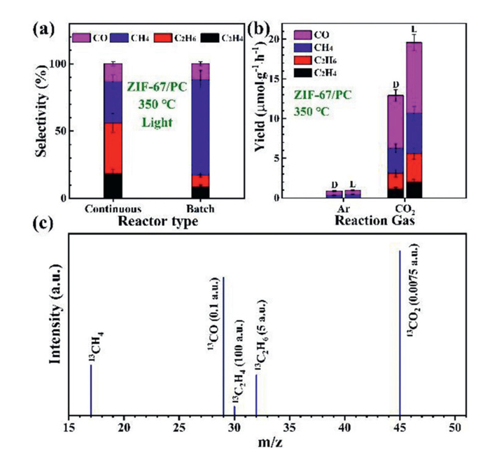 Figure 9.  Comparison of catalytic performance between batch process and continuous process after 1 h reaction (a), comparison of catalytic performance under the condition of Ar and CO2 as raw gas (b), The mass spectra results for 13CO2 thermo-photo reduction on ZIF-67/PC (c).