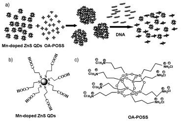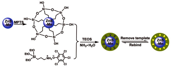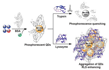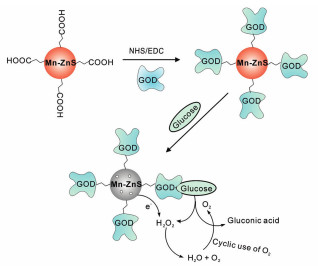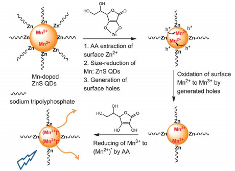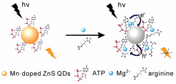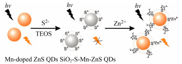 1. 引言与一般有机染料相比,量子点具有光稳定性高、斯托克斯位移大、发射波长尺寸可调以及水溶性好等优点,广泛应用于光学器件、生物标记、生物传感以及生物成像等领域[1~4]。基于这些优势,基于量子点的荧光识别与传感的研究一直备受关注。虽然量子点的荧光性质已得到广泛应用,但量子点的室温磷光性质及其在生物/化学传感和生物成像中的应用还没有引起足够重视。相对于荧光分析法,室温磷光分析具有以下两大优点。首先,由于磷光的寿命比荧光长,因此在进行磷光检测时可以避免自体荧光和散射光的干扰;其次,磷光相对于荧光是一种更为少见的现象,因此检测时的选择性得到增强。但是,具有室温磷光发射的量子点较少,这也是其发展缓慢的重要原因之一。 在材料科学领域,掺杂是一种用于改善材料性能的常用技术之一,通过在主体材料中加入外来原子或者离子来提高材料的性能[5]。在体相的ZnS材料中掺杂Cu2+能够实现绿色的长余辉发光。Mn2+是一种典型的顺磁性物质,当它掺杂到体相的ZnS材料中,能够引起毫秒级别的长寿命发光[6]。1994年,Bhargava等[7]首次报道了Mn2+掺杂会大幅提高ZnS纳米粒子的发光量子效率。同时,他们发现在纳米粒子中Mn2+的发光寿命比体相材料有了大幅度的衰减,仅为20.5 ns,被认为是由于ZnS的纳米尺度效应引起的。1998年,Bol等[8]通过时间分辨荧光技术在Mn掺杂ZnS量子点中发现了毫秒级别的Mn2+特征长寿命发射,同时指出在Bhargava等[7]研究中,实际上采集的是来自于ZnS的缺陷发射寿命,而不是真正源自于Mn2+的d轨道能级的发射。2006年,Costa-Fernandez等[9]预言Mn掺杂ZnS量子点是一种非常有前途的磷光材料,在室温磷光分析中具有广泛的应用前景。2008年,He等[10]报道了基于Mn掺杂ZnS量子点的室温磷光传感,引起了广泛关注。本综述介绍了基于Mn掺杂ZnS量子点的室温磷光探针的构建及其生物传感应用的研究进展。 2. Mn掺杂ZnS量子点磷光发光机理量子点作为典型的半导体材料,其光致发光原理主要是光激发价带的电子到达导带,从而导致电子与空穴分离,当电子和空穴重新复合时辐射出荧光。Mn掺杂ZnS量子点是一种掺杂型材料,在主体ZnS中插入了Mn2+的三线态能级,从而主体量子点的导带电子有了更多的去向。如图 1所示,主体ZnS价带电子受光激发跃迁到导带,导带的电子主要有两个去向,一是到达量子点的缺陷能级,然后回到价带,辐射出蓝色的荧光,该荧光波长峰值主要分布在420~450 nm,一般呈现纳秒级的荧光寿命;二是电子到达插入主体的掺杂离子能级由于三线态能级(4T1-6A1)的原因,电子不会回到主体量子点的价带,而是发生在Mn2+能级的d-d跃迁,掺杂所发射的波长峰值主要集中在580~600 nm,寿命一般在毫秒级(图 1)。这与Mn掺杂的其它量子点发光机理相似,通过改变不同的主体而实现掺杂量子点的不同光学性能,而Mn的磷光发射性能大致相同[11, 12]。同时Mn掺杂ZnS量子点具有更好的水相合成优势。通过时间分辨光谱可以明确看到两个发射的衰减情况不一致[8]。而且该量子点的室温磷光对氧气不敏感,这也是其作为磷光传感的重要特征之一。 图 1 图 1. Mn掺杂ZnS量子点发光原理及其荧光光谱Figure 1. Luminescence mechanism of Mn-doped ZnS quantum dots (QDs) and typical fluorescence spectrum 图 1. Mn掺杂ZnS量子点发光原理及其荧光光谱Figure 1. Luminescence mechanism of Mn-doped ZnS quantum dots (QDs) and typical fluorescence spectrum3. Mn掺杂ZnS量子点磷光分析发展3.1 无机离子的检测量子点在激发状态下易和供体或者受体发生电子或能量转移,所以基于Mn掺杂ZnS量子点对于无机离子传感分析大多都是基于此机理。另外,量子点的发光性质常随其表面状态及理化环境的变化而改变,尤其量子点的缺陷是一个可以被利用的性质。如图 2所示,通过让S2-对Mn掺杂ZnS量子点的表面产生缺陷,再加入Zn2+选择性地修补缺陷而导致量子点磷光增强的方式对细胞中的Zn2+浓度进行了检测[13]。这样的探索让研究者对Mn掺杂ZnS量子点的相关性质有了更新的认识。同样是基于Mn掺杂ZnS量子点本身的特性,Wu等[14]利用原位生长形成量子点的方式检测实现了对生物信使分子硫化氢的检测。以硫化氢充当硫源,通过量子点形成所带来的磷光增强实现了对生物样品中硫化氢的高灵敏检测。这种利用待测物参与合成量子点的策略赋予了探针的选择性,为专一性识别提供了新思路。 图 2为了提高传感器对分析物的特异性,通常将具有离子选择性的配体修饰在量子点上。Xie等[15]发展了一种通过在Mn掺杂ZnS量子点上包裹CTAB的无标记方法实现了Hg2+检测。CTAB可以吸附由Hg2+诱导形成的DNA双链,使得量子点与Hg2+发生电子转移,进而通过Mn掺杂ZnS量子点的磷光淬灭检测Hg2+浓度。除了在量子点表明修饰小分子配体外,还可以将蛋白质等大分子包裹量子点来提高体系的抗干扰能力和选择性。Zhao等[16]用牛血清蛋白合成的Mn掺杂ZnS量子点实现了Cr3+的高灵敏检测。Cr3+与蛋白质中的多个羧基配位诱导量子点的电子转移到Cr3+从而导致Mn掺杂ZnS的磷光淬灭。这些成功的例子为以后对无机离子的可调控测定奠定了良好的基础[17~20]。 3.2 有机小分子传感相比于无机离子而言,有机小分子的检测略显复杂,因为需要传感器具有更好的选择性。由于有机小分子与生命活动的密切性尤为重要,因此建立分析这类物质的磷光传感器具有重要意义。如图 3所示,为了
