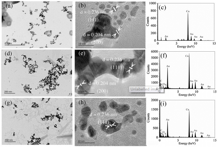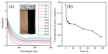 Figure 1. Evolution of (a) UV–vis spectra and (b) concentration of ionic Au in AuCl4- -DOM solution under sunlight. Conditi ons: 5 mg C/L Aldrich humic acid, 1 mmol/L HAuCl4, pH 5.80, natural sunlight irradiation and air temperature (25-37 ℃).The transmission electron microscopy (TEM) images and energy dispersive X-ray spectroscopy (EDS) (Fig. 2) were used to validate the formation of AuNPs. Besides spherical nanoparticles, the branched nanocrystals including bipod and tripod were also observed. The high resolution TEM images (Figs. 2b, e and h) showed that the distances between two adjacent planes in nanoparticle are mainly 0.236 and 0.204 nm, corresponding to the Au(111) and Au(200) lattice planes. The EDS spectra (Figs. 2c, f and i) further confirmed that the particles in TEM are Au-containing nanoparticles. Under sunlight irradiation, firstly generated spherical AuNPs play as seeds for further particle growth. The high energy due to large surface-to-volume ratio and high collision frequency contribute to great mobility of these initially small AuNPs and drive their attachment [32]. The branched nanocrystals are likely to be formed by the further reduction of AuCl4- and attachment-based growth of adjacent spherical AuNPs [32, 33]. According to our previous study [24], in the photochemical reduction process, DOM serves as not only the reductive agent, but also the coating agent to stabilize and disperse AuNPs. Phenolic, alcoholic, and aldehyde groups in DOM act as reductive sites and Au(Ⅰ) is an important intermediate in this reductive process [24].