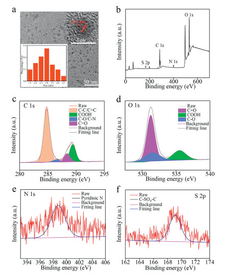 Scheme 1 showed the fabrication process of N, S-CDs. The morphology of N, S-CDs was obtained by transmission electron microscopy. The results were shown in Fig. 1a, N, S-CDs were uniformly dispersed nanospheres with a particle size of 2.59 ± 0.76 nm having well-resolved lattice structure with a d interval of 0.14 nm. To evaluate the functional component of N, S-CDs more accurately, X-ray photoelectron spectroscopy (XPS) was employed and results were shown in Fig. 1b. The two intensity peaks of the XPS spectrum were attributed to C 1s (284.80 eV) and O 1s (531.27 eV) respectively. And the XPS spectrum also showed that N, S-CDs contain N and S elements with the peaks at 397.73 eV (N 1s) and 168.99 eV (S 2p) respectively. The contents of C, N, O, and S were 50.15%, 0.75%, 48.58% and 0.52% respectively and were shown in Table S1 (Supporting information). As we can observe from Fig. 1c, the high-resolution C 1s spectra exhibited four peaks, and the four peaks separately represented sp2 carbons (C-C/C = C, 284. 8 eV), sp3 carbon (C-O/C-N, 286.58 eV), and carbonyl carbons (C=O, 288.42 eV; COOH, 289.4 eV); The O 1s spectra contained three peaks located at 531.28 eV, 531.47 eV and 535.5 eV (Fig. 1d), which were respectively attributed to C = O, C-O and COOH [21]. The high-resolution N 1s spectra showed a single peak (Fig. 1e), which was located at 398.56 eV and attributed to pyridinic N [22]; the high-resolution S 2p spectra also possessed only one peak (Fig. 1f), representing C-SOX-C [23, 24].