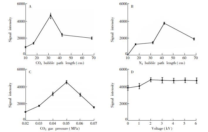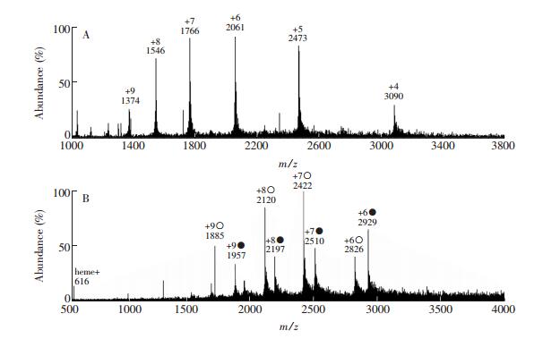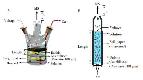 1. 引言复杂样品中蛋白组分的分离分析是生命科学研究的重要内容,也是蛋白质分析科学的前沿和热点领域之一。常用分离技术包括层析分离[1]、电泳分离[2]、色谱分离[3, 4]等。凝胶电泳[5]是分离复杂生物样品中蛋白质的常用方法,电泳分离后的蛋白质可进行酶解提取,再用色谱-质谱分析。由于该过程需要蛋白质水解、提取或脱盐等繁杂手续,导致耗时、低效,且易造成蛋白质流失。为了获取纯化的蛋白组分,通常需要溶质析出、透析、超滤、色谱分离、化学提取、冷冻干燥、重结晶等多步骤精细处理过程,使其无法满足复杂样品中蛋白组分高通量分析的实际需求。因此,开发复杂生物样品中蛋白组分直接分析的高灵敏方法具有重要意义。 近年来快速发展起来的常压电离质谱技术可在无需样品预处理的条件下直接检测复杂基体样品中的痕量待测组分,为复杂基体样品的直接、快速分析提供了新手段。常压直接电离技术如电喷雾解吸电离(DESI)[6]、常压化学电离(ACDI)[7]、电喷雾萃取电离(EESI)[8, 9]、超声喷雾电离(SSI)[10]和纸喷雾(PS)[11]等已被用于复杂样品中蛋白组分的快速分析,而且在蛋白结构测定[12]、酶活检测[13]、蛋白相互作用[14]等方面也取得了重要进展。但因生物样品的复杂性和特异性,探索生物样品中痕量蛋白组分快速质谱分析的新原理仍然具有重要的现实意义。本研究采用自行搭建的气液荷电萃取电离(CBEI)装置,可直接实现溶液中蛋白组分的荷电萃取和快速质谱分析。系统考察了不同萃取气体(如N2和CO2)、气泡路径长度、溶液电压、气压等条件对溶液中溶菌酶蛋白荷电萃取电离的影响。结果表明,与相同条件下所获得的溶菌酶ESI-MS谱图相比,气液荷电萃取电离方法可获得更多低价态的蛋白质多电荷离子,且对溶液中的非挥发性无机盐具有更强的耐受性。本方法具有无需样品预处理、无化学试剂污染等特点,可快速实现溶液中蛋白组分的直接质谱分析,有望为生物蛋白样品的研究提供一种质谱分析新方法。 2. 实验部分2.1 仪器与试剂气液荷电萃取电离装置为本实验室自制; Orbitrap FusionTM TribridTM质谱(美国Thermo Scientific公司),配有Xcalibur 3.0数据处理系统。溶菌酶(纯度95%)、细胞色素C(纯度95%)和肌红蛋白(纯度95%~100%)均购于北京索莱宝科技有限公司; 辣根过氧化物酶(酶活性≥250.0 U/mg,国药集团化学试剂有限公司); 醋酸铵(色谱纯,美国Fisher公司); 实验用水由Milli-Q超纯水净化装置(美国Millipore公司)制备。 2.2 实验装置与测定方法两种实验装置如图 1所示。装置1的基本参数如下:气溶胶出口与质谱入口距离a为7.5 mm; 气溶胶出口直径b为25 mm; 玻璃容器内径c为110 mm; 容器整体的容积约600 mL,实验时加入样品溶液约250 mL; 气体扩散器的孔径约100 μm。将浓度为10-6 mol/L溶菌酶的醋酸铵(2 mmol/L)溶液置于装置1的玻璃容器内,通过一根导线向溶液施加一定的电压,并用一根金属线缠绕在玻璃容器的外壁与地线相连。装置2的基本参数如下:玻璃管顶端与质谱入口的距离a为7.5 mm; 玻璃管顶端的气溶胶出口直径b为5 mm; 玻璃管内径c为25 mm; 容器整体的容积约520 mL,实验时加入样品溶液的量为6~160 mL; 气体扩散器孔径约为100 μm。将浓度为10-6 mol/L溶菌酶的醋酸铵(2 mmol/L)溶液置于装置2的玻璃管内,通过一根导线向溶液施加一定的电压,并用锡箔纸包覆在玻璃管的外壁与地线相连。两种装置的工作原理如下:在电场的作用下溶液中的蛋白分子带电,由容器底端通入的气体经气体扩散器后形成小气泡, 气泡对溶液中的目标分子蛋白具有一定的选择性作用,气泡上升的过程中可将溶液中的蛋白分子富集到气泡表面,从而实现了溶液中蛋白分子的萃取分离,也减少了小分子、无机盐的干扰,从而减弱了它们对蛋白质电离的抑制效应。气泡达到溶液表面后破裂,形成含蛋白分子的带电气溶胶,经过去溶后形成气相蛋白质分子离子直接进入质谱仪获得检测。质谱仪采用正离子扫描模式; 离子传输管温度为320℃; 质量扫描范围为m/z 100~4000 Da; 其它检测参数由质谱仪系统自动优化得到。 图 1 图 1. 气液荷电萃取电离质谱装置示意图。A.装置1; B.装置2Figure 1. Schematic diagram of the charged bubble extractive ionization mass spectrometry platform. A. device 1; B. device 2 图 1. 气液荷电萃取电离质谱装置示意图。A.装置1; B.装置2Figure 1. Schematic diagram of the charged bubble extractive ionization mass spectrometry platform. A. device 1; B. device 23. 结果与讨论3.1 溶菌酶溶液的气液荷电萃取电离质谱分析控制CO2气体压强为0.2 MPa,气泡路径长度(溶液高度)为3 cm,按照2.2节的方法,采用装置1对10-6 mol/L溶菌酶-醋酸铵(2 mmol/L)溶液进行气液荷电萃取电离质谱分析。从图 2B可见,出现了特征质谱峰,如m/z 2862(z=5)、m/z 2385(z=6)、m/z 2044(z=7)、m/z 1789(z=8)、m/z 1590(z=9),这表明装置1可检测到溶菌酶多电荷离子(z=5~9),但是信号强度及信噪比较差。可能的原因如下: (1)装置1本身的高度和容量使气泡路径长度较短,导致气泡对溶液中蛋白的富集效果较差; (2)装置1中气泡破裂产生的气溶胶大部分被容器内壁阻挡回落; (3)装置1气溶胶出口太宽,气溶胶束发散,导致进入质谱口的样品离子较少。 图 2控制CO2气体压强为0.05 MPa,气泡路径长度为32 cm,按照2.2节的方法采用装置2对10-6 mol/L溶菌酶-醋酸铵(2 mmol/L)溶液进行气液荷电萃取电离质谱分析。从图 2A可见,溶菌酶的特征离子价态分
