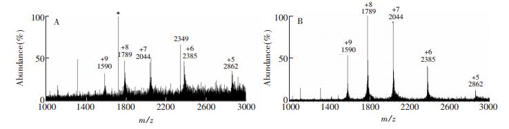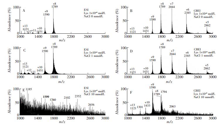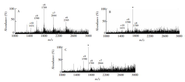 图 4 ESI-MS与气液荷电萃取电离质谱脱盐效果比较 Figure 4 Comparison of desalting effects in charged bubble extractive ionization mass spectrometry (CBEI-MS) and ESI-MS. ESI-MS analysis of lysozyme solution (1×10-6 mmol/L) containing 0 mmol/L (A), 1 mmol/L NaCl (C) and lysozyme solution (1×10-5 mol/L) containing 10 mmol/L NaCl solute (E); charged bubble extractive ionization mass spectrometry analysis of lysozyme solution (1×10-6 mol/L) containing 0 mmol/L (B), 1 mmol/L NaCl (D) and lysozyme solution (1×10-5 mol/L) containing 10 mmol/L NaCl solute (F) A、C和E分别为1×10-6 mol/L的溶菌酶溶液中含NaCl浓度为0、1和0.01 mmol/L溶菌酶溶液中含10 mmol/L NaCl的ESI-MS谱图; B、D和F分别为1×10-6 mol/L的溶菌酶溶液中含NaCl浓度为0、1和0.01 mol/L溶菌酶溶液中含10 mmol/L NaCl的气液荷电萃取电离质谱图 图 5 尿液中痕量蛋白的气液荷电萃取电离质谱检测。*表示背景离子 Figure 5 Detection of trace protein in urine by charged bubble extractive ionization mass spectrometry Concentration of lysozyme in urine diluted (200 times in ultrapure water) (A) 1×10-6 mol/L, (B) 1×10-7 mol/L, concentration of lysozyme in undiluted urine (C) 1×10-5 mol/L. (note: * represents background ion)