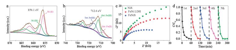 (11) The electrochemical impendence spectra (EIS) spectrum in Fig. 4c shows that FeNiS catalyst features the smallest Rct at catalyst/electrolyte interface than that of other two catalysts (NiS and FeNi LDH), indicating the Fe introduction and sulfidation treatment can result in a more facile charge transfer kinetics. Catalyst stability was also evaluated (Fig. 4d and Fig. S3 in Suppoprting information), the results show that FeNiS remains the same catalytic performance even after five cycles and so was the dechlorination stability. The reaction kinetics was also calculated to visualize the recyclability (Fig. S4 in Supporting information). All these results indicated that FeNiS with prominent ability of sulfate radical activation would be a hopeful catalyst for chloric organic compounds pollution purification.