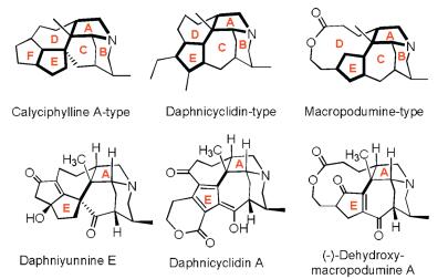 Figure 1. Representative structures of calyciphylline A-type, daphnicyc-lidin-type and macropodumine-type alkaloidsIn our previous work, we have developed an efficient approach to access fast and stereoselective construction of 2, 3, 4-cis trisubstituted pyrrolidine 1 via tandem N-allylation/SN2' reaction [8d]. Methylation of the α-position of lactone of 1, followed by hydrolyzing the lactone, a carboxyl group at the 3-position could be delivered, which will produce a tertiary carbon radical under the catalysis of iridium or ruthenium complex. Consequently, it is reasonable that if the new generated free radical was captured by a cyclopentenone, the AE bicyclic system will be constructed.