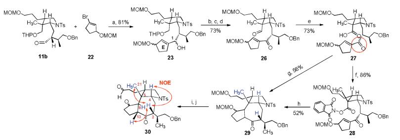 Scheme 5 Construction of ACE tricyclic of dehydroxymacro-podumine A by decarboxylation conjugate addition. Reagents and conditions: (a) 22, t-BuLi, THF, 78 ℃; (b) DMP, DCM, 25 ℃; (c) 1 mol/L HCl, MeOH, 25 ℃, 24 h; (d) DMP, DCM, 25 ℃; (e) NaH2PO4, NaClO2, t-BuOH/CH3CN/H2O = 2:2:1, 0 ℃–25 ℃; (f) N-hydroxy-phthalimide, DIC, THF, 25 ℃, 24 h; (g) 1 mol% Ir[dF(CF3)ppy]2(dtbbpy)PF6, K2HPO4, DMF, 25 ℃, 26 W GFL, 16 h; (h) diethyl 1, 4-dihydro-2, 6-dimethyl-3, 5-pyridine-dicarboxylate, CH2Cl2, DIPEA, blue light, [Ru(bpy)3](BF4)2, 25 ℃, 2 h; (i) 3 mol/L HCl, MeOH, 12 h; (j) DMP, DCM, 25 ℃
