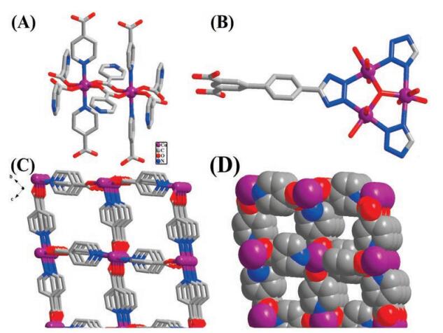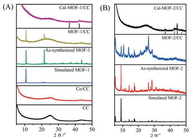 Figure 1. Coordination modes of (A) Co(Ⅱ) ions and INA in 1, and (B) Co(Ⅱ) ions and TPI in 2. (C, D) View of 3D porous framework of 1 along a-axis. All hydrogen atoms are omitted for clarity.PXRD measurement proves the successful synthesis of Co-MOFs on CC (Fig. 2), which was further transferred into Co oxide nanoparticles. As shown in Fig. 2, the XRD peaks of these Co-MOFs and Co-MOFs on CC are similar to the simulated patterns from single crystal data, indicating a purity of the bulk samples, and the successful synthesis of Co-MOFs on CC. After calcination, the diffraction peaks of the MOFs disappeared. For 3, only two peaks in consistent with (111) and (200) facets of CoO (JCPDS card No. 43-1004) were observed at 36.5° and 42.4° (Fig. 2A). In the XRD of 4, four weak peaks related to (311) and (400) facets of Co3O4 (JCPDS card No. 43-1003), (200) facets of CoO (JCPDS card No. 43-1004) and (101) facets of Co (JCPDS card No. 15-0727) were detected at 36.845°, 44.808°, 42.4° and 47.568°, respectively (Fig. 2B).