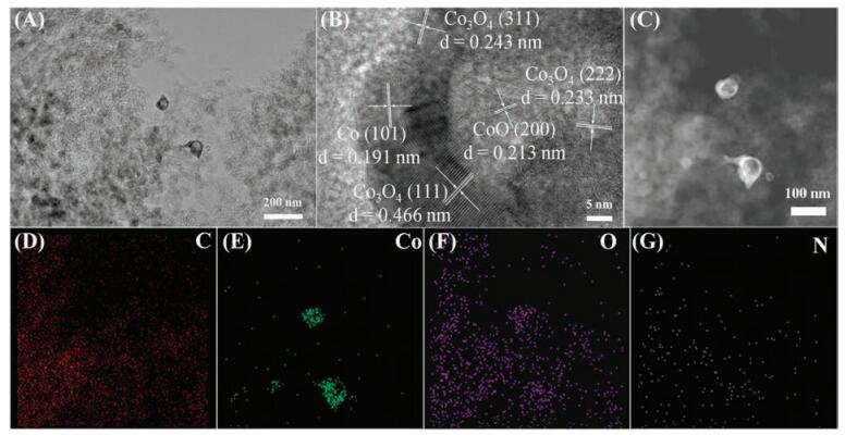 To further analyze the morphology and composition, highresolution transmission electron microscopy (HRTEM) was performed on the as-synthesized 3 and 4. As shown in Fig. 3 and Figs. S3, S4 (Supporting information), the carbon matrix of 3 and 4 maintains the morphology of pristine CC (Fig. S5 in Supporting information), while the nanoparticles randomly distributed on the carbon matrix. HRTEM images of 3 show the crystalline nanoparticles were embedded in the carbon matrix, and the crystalline lattice spacings of these nanoparticles are 0.245 nm and 0.213 nm (Fig. S3B), corresponding to the (111) and (200) crystal orientation of CoO. As shown in Fig. 3B, the crystal lattice spacings on the crystalline nanoparticles in 4 are 0.466 nm, 0.243 nm, 0.213 nm and 0.191 nm. The first two lattice spacings correspond to the (111) and (311) crystal orientation of Co3O4, the first two lattice spacings can be attributed to the (200) crystal orientation of CoO and (101) crystal orientation of Co, respectively. Energy-dispersive X-ray spectroscopy (EDS) elemental mapping images also confirmed that the majority of Co and O elements distribute in the crystalline cobalt oxide nanoparticles on the carbon matrix (Figs. S3C–G and Figs. 3C–G). EDS study indicated the existence of trace amount of Co (Fig. S6 in Supporting information), which is consistent with inductively coupled plasma mass spectrometry (ICP-MS) results. The loading amount of Co content in 3 and 4 was determined to be 3.3 wt% and 4.2 wt%, respectively.