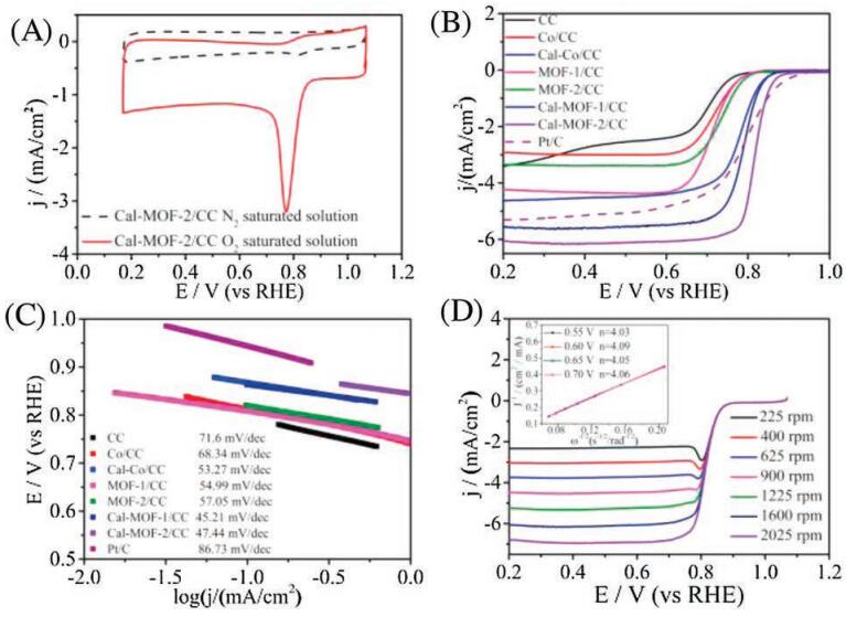 Figure 4 (A) CV plots of 4 in N2-saturated and O2-saturated 0.1 mol/L KOH aqueous solution at a scan rate of 10 mV/s. (B) LSV curves and (C) Tafel slopes of 3, 4 and other comparative catalysts at 1600 rpm. (D) LSV curves of 4 at different rotating speeds of RDEI, showing the K–L plots at various potentials.
