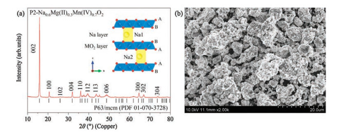 Figure 1. Crystal structure and particle morphology. (a) X-ray diffraction pattern and (b) typical SEM image of as-prepared Na0.6[Mg0.3Mn0.7]O2 sample.The quantitative analysis of the as-prepared Na0.6[Mg0.3Mn0.7] O2 sample was then carried out using ICP-AES, and the results are shown in Table 1. The experimental value is in good agreement with the designed stoichiometric of Na0.6[Mg0.3Mn0.7]O2, thus confirming that the valence of almost all manganese in the compound is +4. EDS mapping of Na0.6[Mg0.3Mn0.7]O2 was also conducted to confirm the elemental distribution. The elemental mappings of Na, Mg, and Mn are displayed in Fig. 2, exhibiting a uniform distribution of sodium, magnesium, and manganese in the sample.