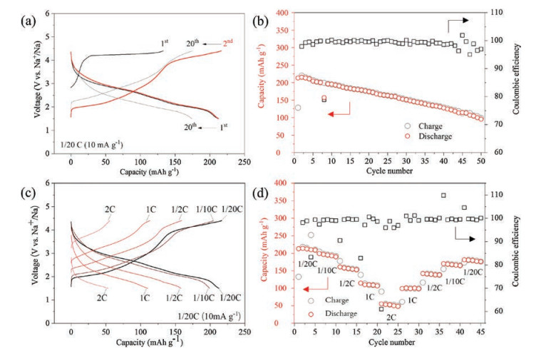 All the electrochemical tests were conducted using coin cells (CR2032), assembled in an argon filled glove-box. The working electrode was prepared by rolling out the mixture of active material (80 wt%), Super P (15 wt%) and polytetrafluoroethylene (PTFE 5 wt%) into thin films, followed by cutting into equal-area pieces and drying at 120 ℃ in vacuum for 10 h. The loading mass of active material on positive electrode was controlled to 6.0-7.0mg/cm2. The electrolyte wasa solutionof1 mol/LNaClO4 inethylene(EC), dimethyl carbonate (DMC), propylene carbonate (PC) (1:1:1 in volume) and fluoroethylene carbonate (FEC) (2% involume). Sodium foil was used as the counter electrode and glass fiber was used as the separator. The charge and discharge tests were carried out using a Land CT2001 A battery test system (Wuhan, China) in a voltage range of 1.5-4.4 V at various C-rates at room temperature.