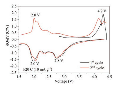 The differential capacity curves of the first and second cycle are shown in Fig. 4. There are two pairs of oxidation/reduction peaks: the first pair at 4.2 V/2.8 V and the second pair at 2.0 V/2.0 V. The first pair of oxygen redox shows large polarization, which is similar to the phenomenon in Li-air batteries, while the second Mn4+/Mn3+ redox pair displays small polarization. The other small peaks could be caused by the Na/vacancy ordering, which is usually found in many manganese-based NIB materials. Notably, there is only one peak in the first charge process, once again confirming that only oxygen redox participates into the charge compensation mechanism. In the second cycle the oxygen redox peak shifts slightly to lower voltage, which might be caused by the involvement of Mn4+/Mn3+ redox during the second charge process, indicating that the Jahn-Teller distortion introduced by Mn3+ could have subtle effects on the ARR activity and its reversibility.