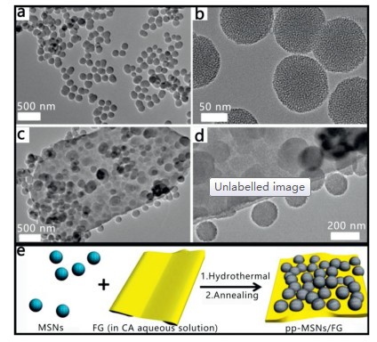 Figure 2 (a, b) TEM images of MSNs with different magnification; (c, d) TEM images of pp-MSNs/FG; (e) the illustration of preparing pp-MSNs/FG nanocomposites. Reproduced with permission [50]. Copyright 2015, American Chemical Society.