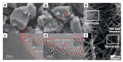 Figure 6 (a, b) SEM graphics of C-SiO and 3% TC-SiO; (c, d) HRTEM graphics of C-SiO and 3% TC-SiO; (e) SEM graphics of SiOx NWs; (f) SEM graphics of pC-SiOx NWs. (a–d) Reproduced with permission [90]. Copyright 2018, Elsevier. (e, f) Reproduced with permission [106]. Copyright 2017, Royal Society of Chemistry.