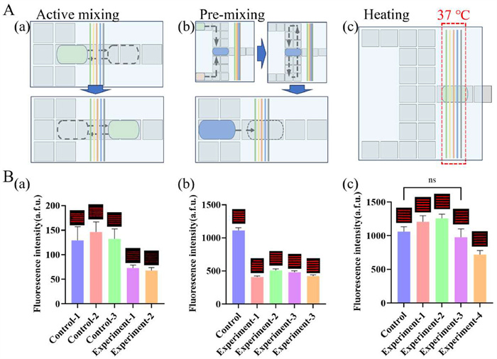 Figure 4  Comparison of different strategies to escalate the analysis efficiency for DMF-actuated immunoassay. Schematic diagram (A) and fluorescence readouts (B) of (a) active mixing, (b) pre-mixing and (c) heating.