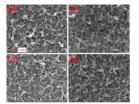 Figure 2 SEM images of the virgin and modified membrane surfaces, showing the loosely crosslinked structures for the active layers of the TFC NF membranes. M0 was the unmodified membrane; M1, M2 and M3 were the membranes modified with different solutions: 2 g/L dopamine in the tris buffer, 2 g/L dopamine and 2 g/L TOB in water, and 2 g/L dopamine and 4 g/L TOB in water, respectively.
