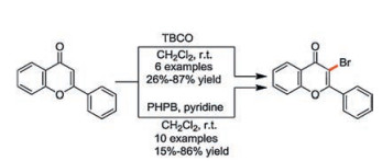 In 1998 and 2002, Joo and co-workers reported successively the C-3 bromination of flavones by employing pyridinium bromide perbromide (PHPB) [67] and 2, 4, 4, 6-tetrabromo-2, 5-cyclohexadienone (TBCO) [68] as the brominating reagent, respectively (Scheme 8). In order to developed synthetic methods using more stable reagents and of broader substrate scope, continuous efforts were made toward 3-halochromone and related flavone synthesis. Rho et al. [69] reported an alternative method to access 3-haloflavones 17 via hypervalent iodine (PhI(OAc)2 promoted reactions of flavones 16 and trimethyl silyl halide (X = Cl or Br). The reactions were run at 0 ℃, and 3-bromo-/chloroflavones could be synthesized, but broad scope of synthesis was not yet defined (Scheme 9).