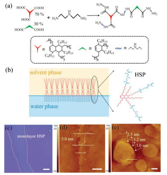 Figure 1 (a) Schematic illustration of the synthesis of HSP molecules. (b) Schematic view of monolayer HSP film formed on CHCl3/H2O interface. (c) The optical microscopy image of monolayer HSP film on SiO2/Si. The scale bar is 200 μm. (d) AFM image of monolayer HSP film on SiO2/Si. The scale bar is 1 μm. (e) AFM image of a multi-layered HSP film. The scale bar is 1 μm.