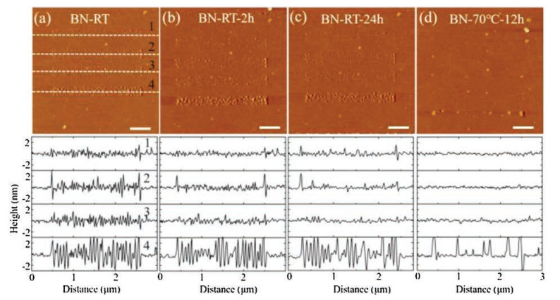 Figure 2 The self-healing process of a monolayer HSP film on h-BN substrate. (a) AFM image of monolayer HSP film after destroyed by AFM tip at different forces. (b-d) AFM images of the HSP film (b) after 2 h at RT, (c) after 24 h at RT, and (d) after 12 h at 70 ℃. The bottom insets are the height profiles of the HSP film along the white dotted lines. The scale bars are 500 nm.