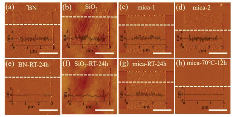 Figure 3 (a-d) AFM image of destroyed monolayer HSP film on h-BN, SiO2/Si, mica-1 and mica-2 substrate, respectively. (e-h) AFM images of destroyed monolayer HSP film after 24 h at RT on h-BN, SiO2/Si, mica-1 substrate and after 12 h at 70 ℃ on mica-2 substrate, respectively. The scale bars are 1 μm.